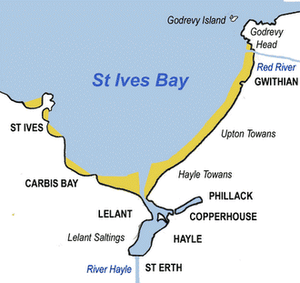 St Ives Bay is a bay on the Atlantic coast of north-west Cornwall in the United Kingdom. It is in the form of a shallow crescent, some 4 miles or 6 km across, between St Ives in the west and Godrevy Head in the east.